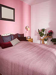 Среди множества цветов для спальни следует выбрать темно-красные (близкие к бордовым, неяркие), насыщенно-зеленые, синие тона. При этом потолок лучше покрасить в один цвет со стенами, с той лишь разницей, что стены могут быть более интенсивных тонов, нежели потолок.