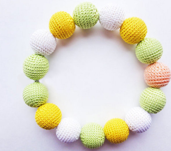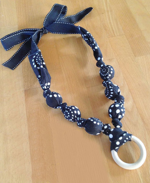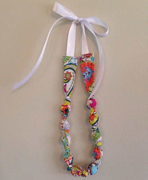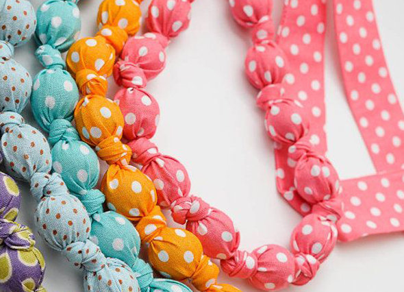 Если под рукой есть деревянные или пенопластовые шарики, их можно обтянуть тканью и собрать в бусы, а также положить на длинную полоску ткани, шириной около 7-10 см, скрутить ткань в жгут и перевязать между каждым шариком.