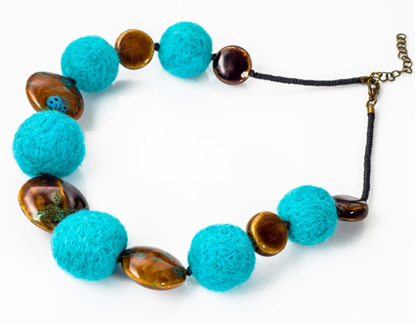 Войлочные бусы очень приятные на ощупь и легкие. Это украшение хорошо сочетается с теплой трикотажной одеждой: платьями, водолазками, свитерами, пуловерами.