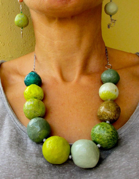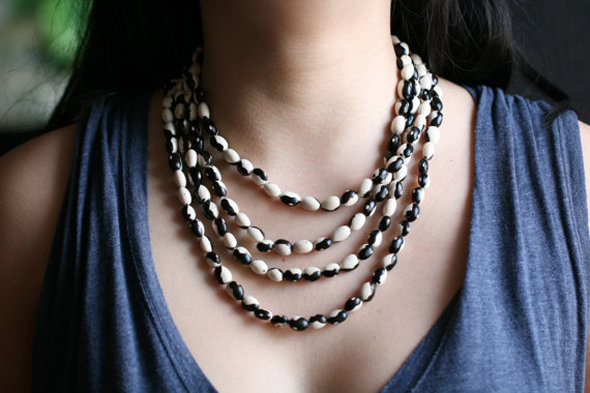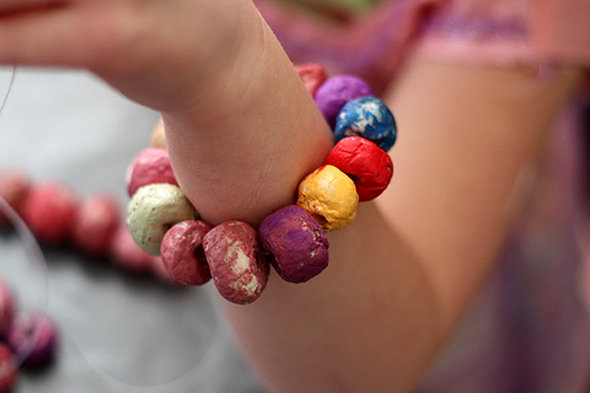 Бусы можно сделать из бумаги, старых газет и журналов. Для этого длинные полоски бумаги скручивают в виде бусин или трубочек и фиксируют кончик клеем, затем покрывают лаком и собирают на нитку. Особенно этот процесс нравится детям, ведь бусы получаются яркими, легкими и очень длинными.