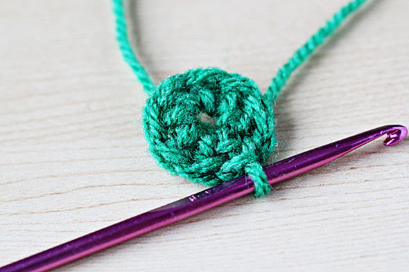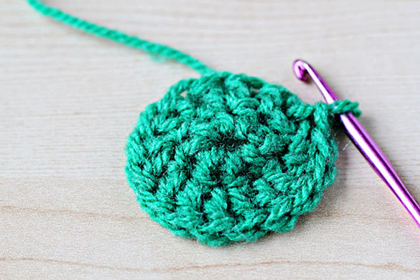 - Свяжите по кругу столбиком с накидом три ряда, прибавляя петли так, чтобы получился плоский небольшой круг.