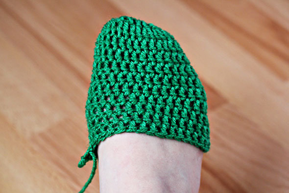 - Далее вяжите 9-10 рядов, почти не прибавляя петель и примеряя изделие на ногу.