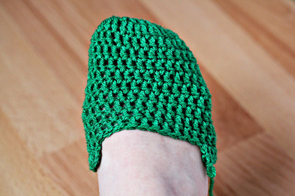- Выверните и обвяжите тапочки по краю, нитки можно взять контрастные. Тапочки готовы!