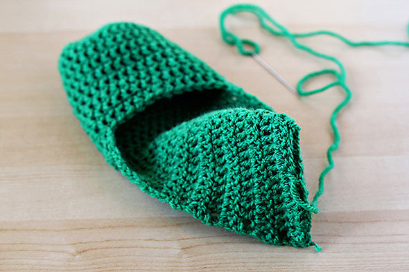 Сшейте верх тапочка и подошву, начиная с центра носка. Иголка должна быть толстой, а нитки – прочными.