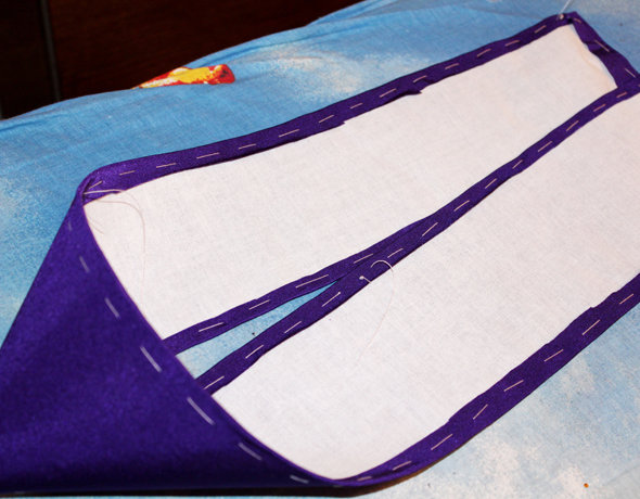 Сантиметровый подгиб отверните на другую сторону, приметайте, а затем на расстоянии нескольких миллиметров от края проложите строчку на швейной машине.