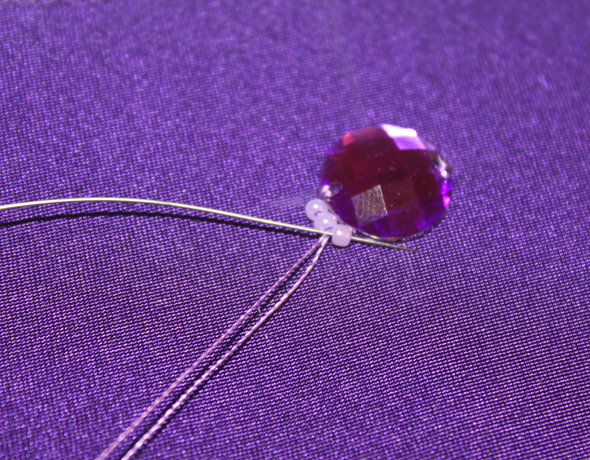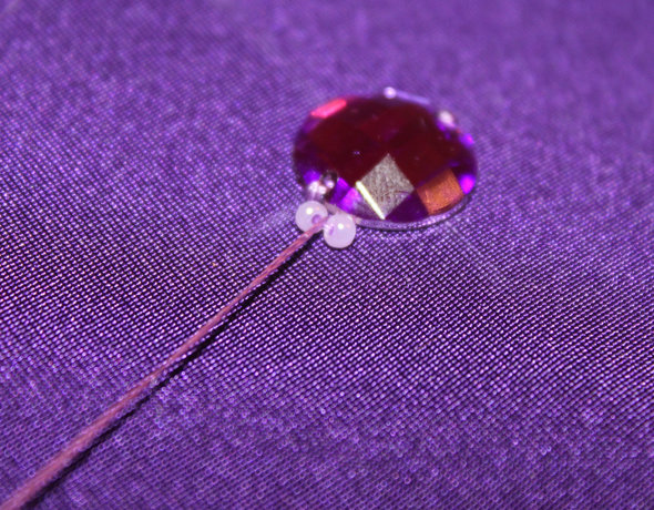 В нужном месте пришейте крупный страз к основе. По краю обшейте его бисером следующим образом: выведите иголку у края страза, наберите две бисерины, пришейте их, выведите иголку между ними, а затем во вторую бисерину.