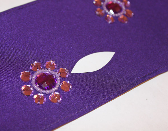 Разложите клеевые стразы равномерно по поверхности пояса клеевой стороной вниз. Паяльником закрепите клеевые стразы по всей поверхности пояса. При отсутствии паяльника стразы можно подержать над свечкой, чтобы клей расплавился, а затем крепко прижать к ткани. При этом удобно пользоваться пинцетом.