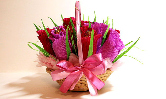 Корзина с цветами из конфет к 8 марта