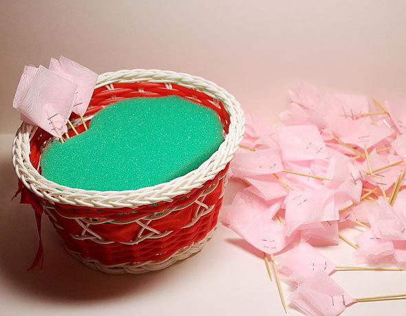 Обрезаем губку по форме корзины так, чтобы она плотно входила в нее и не вываливалась. Если корзина просвечивается, то есть между ее прутьями слишком большое расстояние, то перед закладкой губки закройте дно и стенки небольшим куском материи, гармонирующим по цвету с букетом.