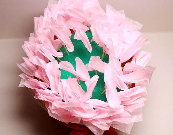 Готовые цветы из конфет распределите равномерно в корзине, втыкая шпажки в губку. Дополните букет декоративными элементами по своему усмотрению.