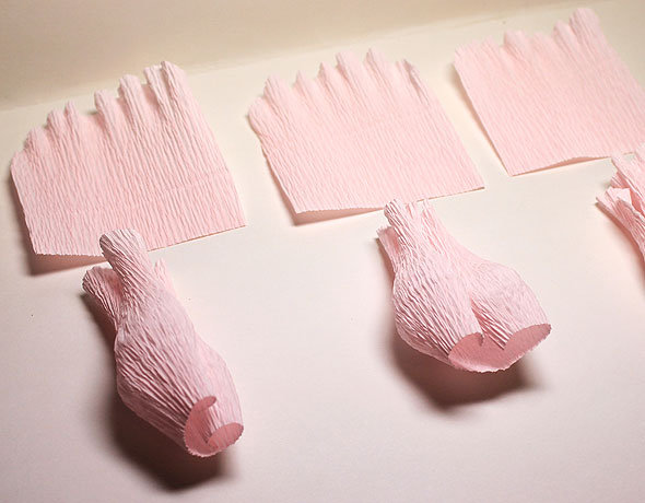 Гофрированную бумагу режем на квадраты со стороной 7 см и закругляем концы, как показано на фото. Можно использовать один цвет бумаги для букета, а можно несколько, учитывая сочетание цветов. Мы выбрали розовую и белую бумагу.