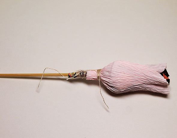 На тупой конец шпажки прикладываем хвостик конфеты и крепко приматываем ниткой.