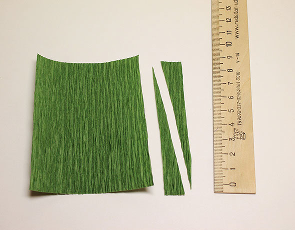 Из зеленой бумаги вырезаем листочки: прямоугольник со сторонами 9 на 1,5 см разрезаем по диагонали.