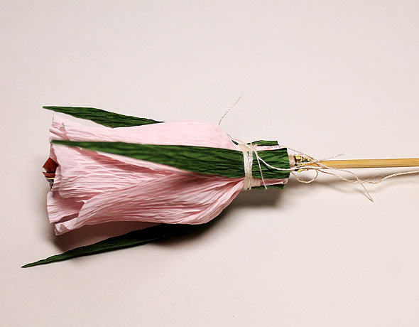 Добавляем листочки к бутону, фиксируем ниткой.