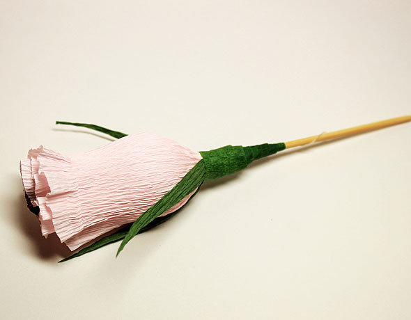 Флористической лентой закрываем основание бутона, обматываем по спирали. Для лучшего скрепления ленту нужно немного растянуть и наматывать плотно.