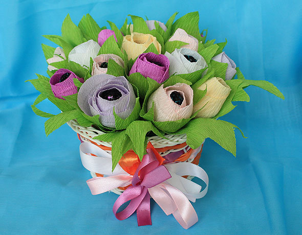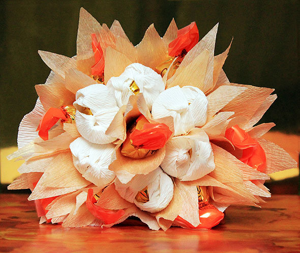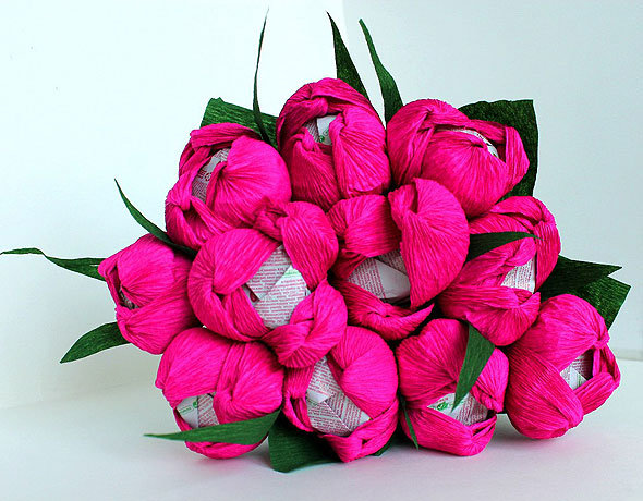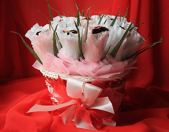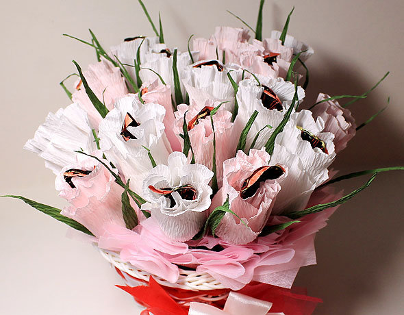 Цветы и конфеты – самые популярные и универсальные подарки, которыми трудно не угодить. Они всегда поднимают настроение, причем независимо от пола и возраста. Но если совместить эти два подарка, то получится оригинально: конфеты будут завернуты в бумажные цветы и срок хранения такого букета зависит от срока хранения конфет. Иными словами, тот, кто получит такой сюрприз, решит сам, любоваться ли букетом, съесть его сразу или подать к столу на праздник.
