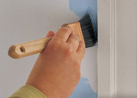 В первую очередь необходимо окрасить углы. Для этого воспользуйтесь плоской кистью. Опустите ее в краску, удалите излишки краски, отжав кисть о стенку контейнера или банки. Аккуратно нанесите краску на стену.