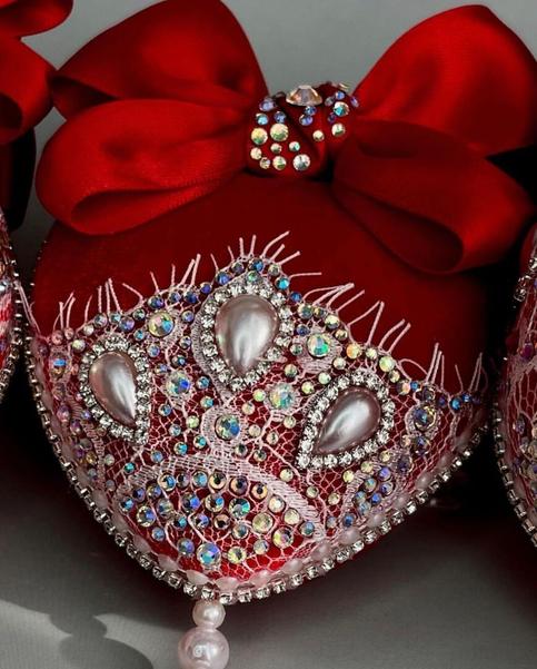 Свои игрушки я делаю только из качественных и самых лучших материалов. Бархат, кисточки, лепнина, лента двухсторонняя мягкая, множества кристаллов и камней, ажурные кружева — все это я использую для создания шедевров. Основа — пластик. Если есть маленькие дети, можно не бояться, что игрушка разобьется.