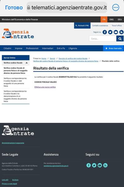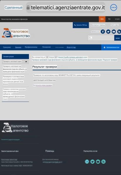 Все эти данные совпадают с информацией о Богомолове, который родился 23 июля 1975 года. «Страсти» проверили номер на официальном сайте налогового агентства Италии, который подтвердил, что код является действующим.