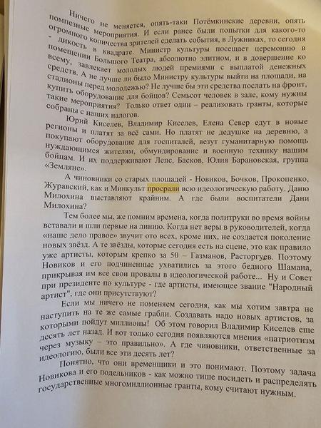 Также приводятся слова Киселева из Telegram-канал Кремлевский шептун. Владелец «Русской медиагруппы» заявляет: «Пятнадцать лет он (SHAMAN) сам пробивался, большим трудом достиг успеха, а теперь его кураторы из Администрации Президента, которые ничего не сделали для его популяризации, таскают его как чучело в базарный день или уродца в цирке Шапито, а других артистов выставляют вторым сортом, его свитой».