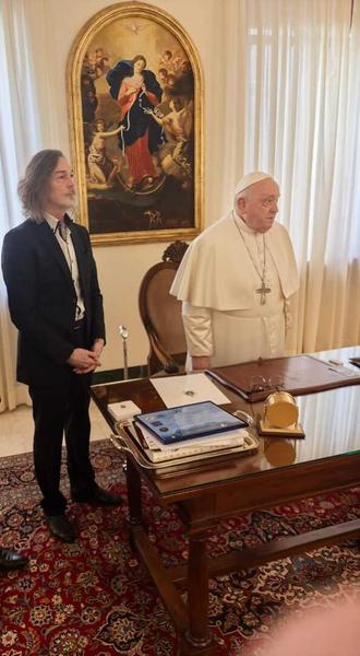 Никас Сафронов встретился с Папой Римским в Ватикане и подарил ему картину, побывавшую в космосе. По словам художника, знакомство с Папой стало для него настоящим чудом. Когда-то Никас написал храм Сан-Хосе-де-Флорес в Буэнос-Айресе, в котором глава Ватикана начинал службу. И эта работа была в открытом космосе с марта по сентябрь 2022 года, сделав вокруг Земли 3000 оборотов.