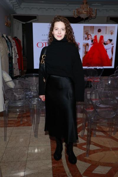 Софья Донианц прибыла на премьеру в total black образе: в длинной шелковой, едва расклешенной юбке и уютном свитере с высоким горлом.