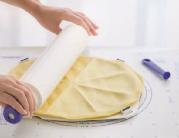 Форма выполнена в виде двухстороннего основания белого цвета. В набор входит специальная мерная ложечка. Одна из сторон разбита на восемь секторов и предназначена для крупных круассанов. Сладкие круассаны предпочтительнее готовить помельче. Для этого удобнее воспользоваться другой стороной формы, где круг разделен на шестнадцать частей.