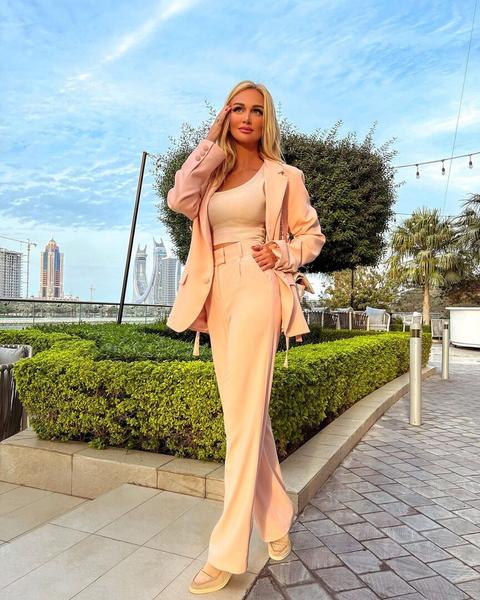 Виктория вышла навстречу солнцу в самых оптимистичных оттенках. Точеную фигуру подчеркнуло платье-футляр цвета молока — классика, которая никогда не проигрывает. К нему — лаконичное силуэтное пальто с акцентом на талии и контрастными меховыми деталями. Все вариации на тему зеленого (от благородного изумруда до золотистого лайма) не покидают топы трендов уже несколько сезонов подряд. Так что если вам наскучили монохромные образы в офисной гамме — экспериментируйте! Дополнили аутфит звезды замшевые лодочки цвета мокко и темные солнцезащитные очки.