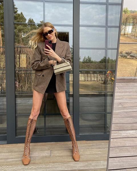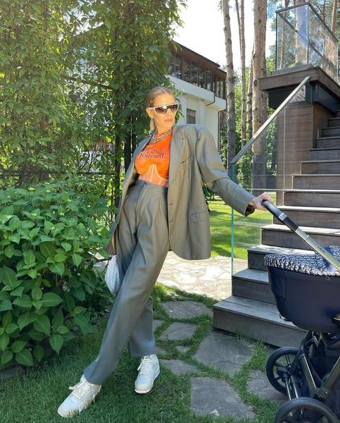 На онлайн-просторах этому комплекту Miu Miu уже присвоен статус sold out. Речь — о двойке из миди-юбки с эффектным разрезом и топе с пышными рукавами. Берите на заметку принт: контрастный мотив с анемонами, будто нарисованными детьми. Дополняют образ нейтральные сандалии-слайды цвета капучино и еще один объект желания из списков фэшиониста — мини-сумка Double Knot от Bottega Veneta. Стоимость аксессуара составляет 185 000 рублей.