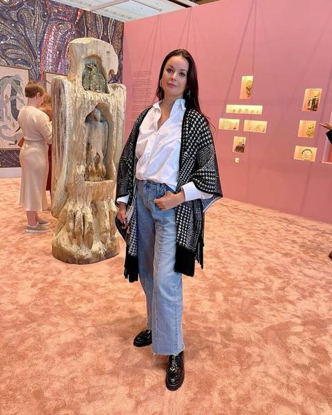Федорова выбрала правильный баланс. В основе — силуэтные брюки, подчеркивающие бесконечные ноги и частично закрывающие обувь, и двубортный блейзер длиной ниже линии бедра. Дополнили образ классические замшевые лодочки и лаконичные украшения.