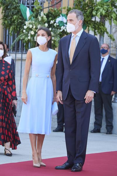 Для культурной программы Летиция выбрала фактурный костюм от испанского бренда Felipe Varela, в котором блистала в 2017 году на праздновании Национального дня Испании (и неоднократно после мероприятия). Чтобы вещи прослужили максимально долго, супруга короля делает ставку на безупречно скроенную классику, которая никогда не проигрывает. И эта двойка из жакета с подчеркнутой талией и миди-юбкой А-силуэта — тому подтверждение.