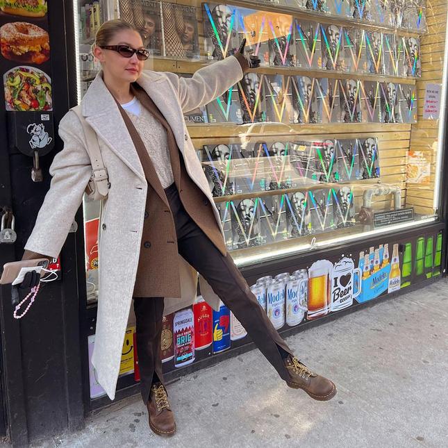 А модель Джиджи Хадид, в отличие от Селены, показала не только самое желанное пальто весны, но и продемонстрировала еще один хит сезона — эффектные облегающие брюки с разрезами. Знаменитая красавица добавила к аутфиту мини-сумочку светло-бежевого цвета с серебряной фурнитурой. Образ звезды завершили темно-коричневые массивные ботинки на шнуровке.
