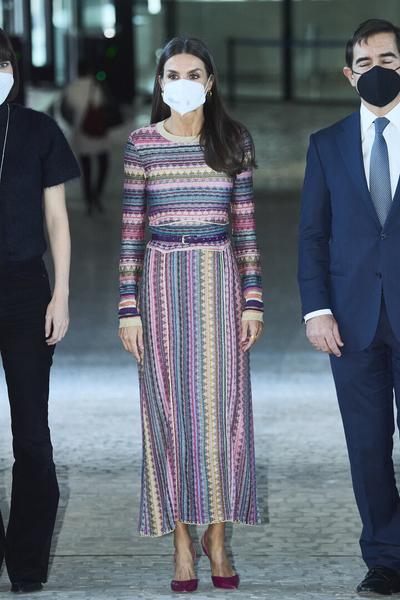 Не так давно королева Летиция сопровождала супруга, короля Филиппа VI, на ярмарке современного искусства в Мадриде. Ее величество составила аутфит на базе безупречно скроенной брючной двойки Ines Martin Alcalde в полуночно-синем оттенке. Маленький, но хитрый трюк — тонкая вертикальная полоска, которая визуально вытягивает силуэт. Дополнили образ неизменные туфли-лодочки.
