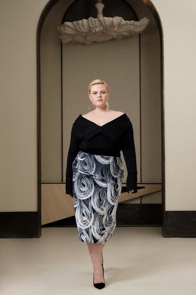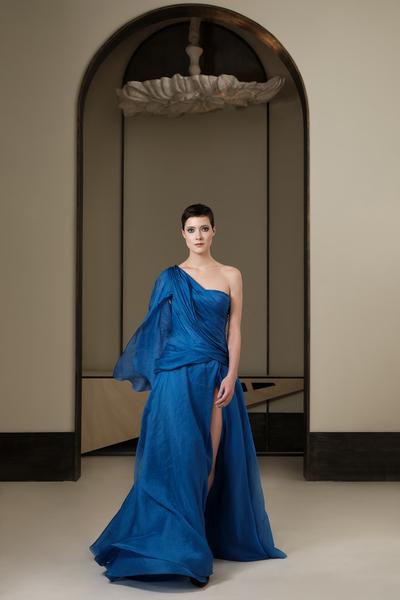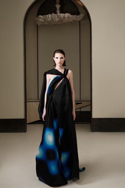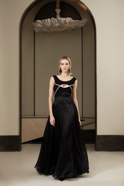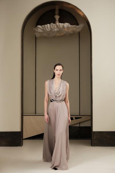 ДНК бренда читается во всем: от мягких драпировок до корсетов. Коллекцией завладели пастельные оттенки: капучино, молочно-белый, небесно-голубой. На контрасте с ними сыграл полуночный черный, разбавленный ультрамариновыми акцентами.