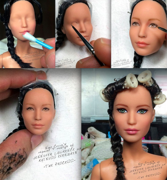 Художник Ноэль Круз известен тем, что умеет превращать обычных кукол в знаменитостей. На днях с молотка ушла очередная «копия» звезды - этот раз он стилизовал обычную Барби под Китнисс Эвердин, главную героиню фильма «Голодные игры», роль которой исполнила Дженнифер Лоуренс.