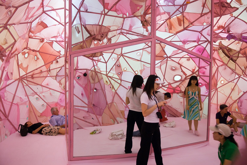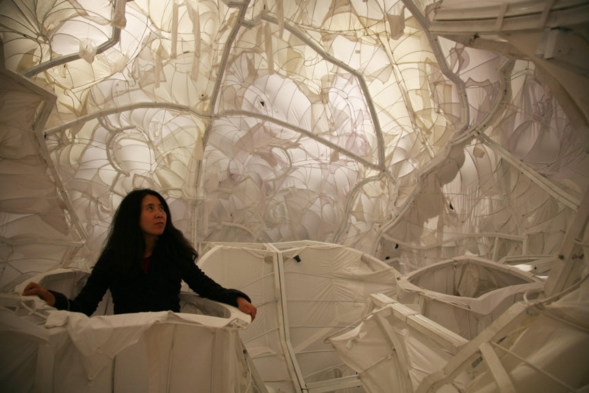 Инь Сючжэнь, художница из Китая, стала автором инсталляции в рамках программы Garage Atrium Commissions. Двенадцатиметровая архитектурная конструкция, внутри которой смогут перемещаться зрители, будет выполнена в форме лекарственной пилюли. Оболочка капсулы будет сшита вручную из более чем двухсот квадратных метров бывшей в употреблении одежды красного и белого цветов, часть которой пожертвовали москвичи.