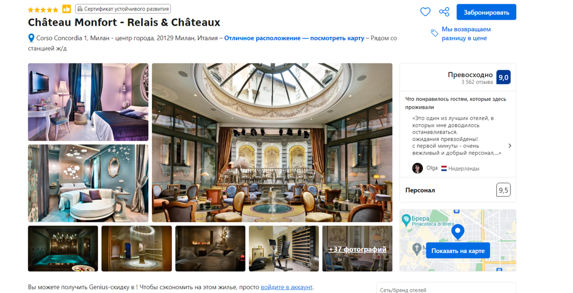 «Отель Château Monfort занимает великолепное здание в стиле либерти начала 20 века. Номера оформлены в тематике различных сказочных, лирических и балетных репертуаров. В оформлении номеров использованы современные элементы, создающие очаровательную атмосферу», — сказано на сервисе для бронирования Booking.com.