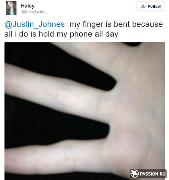 «Мой палец искривился, потому что я весь день напролет держу телефон в руках», – жалуется Хейли другу.