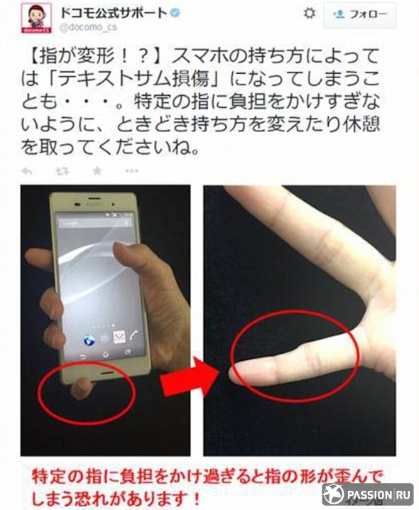 Доктор Тим Эллердайс (Tim Allardyce) из клиники Surrey Physio прокомментировал это так: «Регулярное использование телефонов, требующее частых движений пальцами, особенно переписка с их помощью, в краткосрочной перспективе может привести к гипермобильности мелких суставов, растяжению связок. В долгосрочной перспективе это может вызвать остеоартрит, повреждения хрящей. Часто в местах сгиба организм начинает наращивать дополнительные костные ткани, которые ухудшают внешний вид, увеличивают и деформируют пальцы. Реже привычка держать телефон в определенном положении на протяжении долгого времени деформирует форму рук. Это не опасно для жизни. Но все же людям следует избегать подобных ситуаций. Приобретите устройство Hands-free, для записи используйте бумажные носители. Это поможет соблюсти баланс».