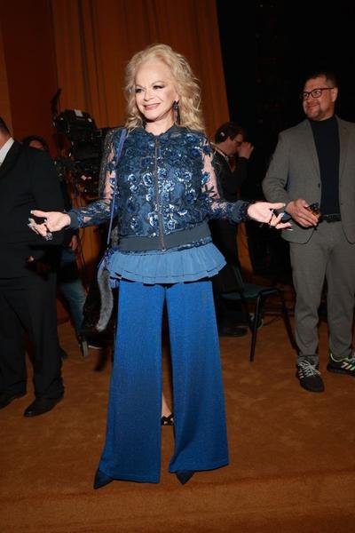 На юбилейном концерте Филиппа Киркорова народная артистка Лариса Долина появилась в оригинальном брючном костюме насыщенного синего цвета. Гипюровый верх в сочетании с широкими брюками вовсе не красил исполнительницу, а кокетливая баска лишь добавила лишний объем в районе талии. Массивные украшения в тон костюму и макияж с акцентом на глаза лишь утяжелили образ, сделав его слишком уж вычурным.