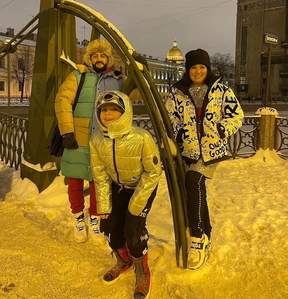 Нетребко в леопардовых лосинах прогулялась с мужем и сыном по заснеженному Петербургу