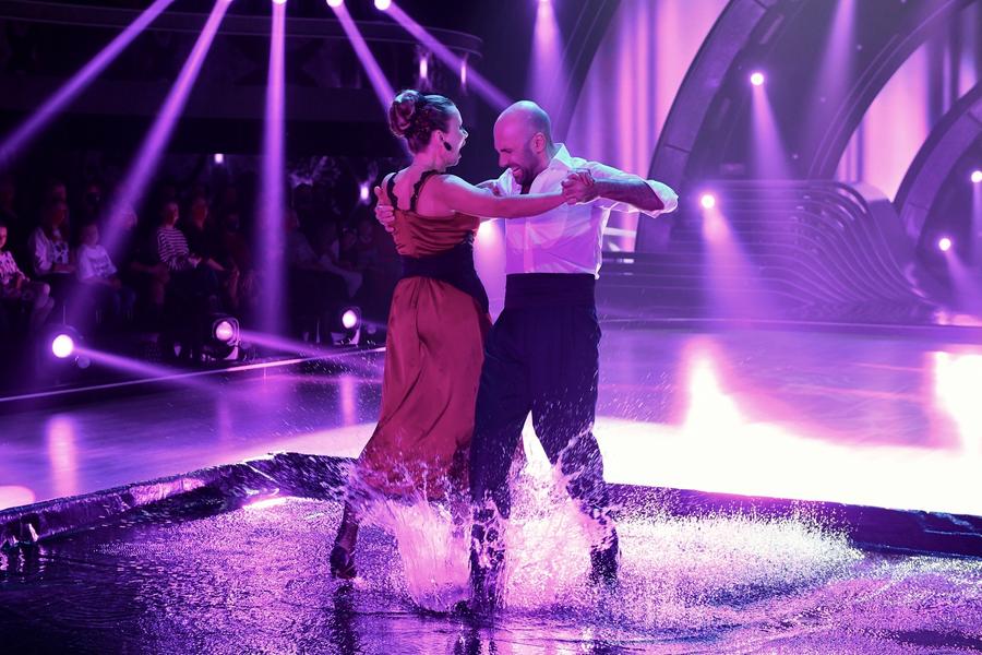 Самым зрелищным номером выпуска стало пылкое танго Марии Мироновой и Евгения Папунаишвили в бассейне! Актриса предстала в образе роковой красотки, которую ее партнер укрощал плеткой.