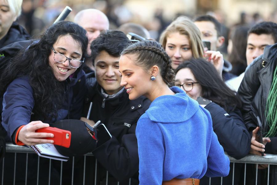 Алисия Викандер для премьерного вечера выбрала костюм Louis Vuitton, похожий на доспехи. Топ и юбка макси нежно-розового оттенка сверкали во вспышках сотен фотокамер.