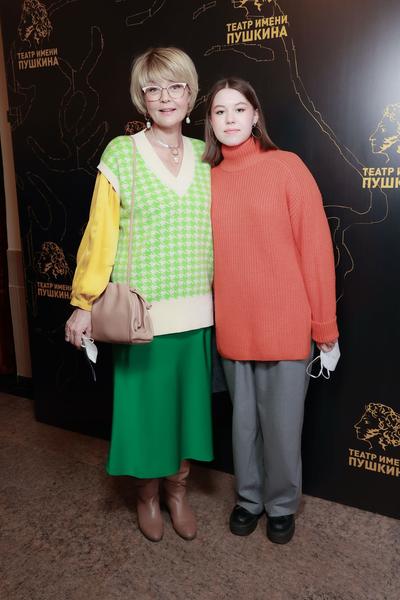 Для вечера в театре Юлия Меньшова выбрала уютный образ: длинную юбку изумрудного цвета, желтую рубашку с пышными рукавами, поверх которой надела жилет в клетку. А ее дочь Таисия появилась в театре в широких брюках и свитере цвета коралла. Нежный макияж подчеркнул красоту девушки.