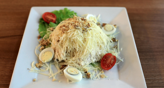 - Куриные грудки отварить, остудить, нарвать волокнами. Яйца отварить. Отделить белки от желтков. Белки нарезать соломкой. Грибы порезать и обжарить с луком на растительном масле. Все компоненты, перечисленные выше (кроме желтков) и зеленый горошек смешать с майонезом(200гр), посолить по вкусу. Выложить в неглубокий салатник на листья зеленого салата. Придать салату форму гнезда.