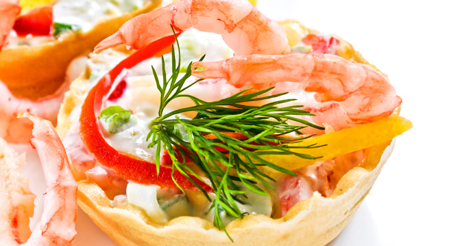 Вырежьте кружки диаметром 5 см. Выложите их в формочки, проткните тесто вилкой и поставьте в холодильник на полчаса. Выпекайте 6-10 мин. - до золотистого цвета. Крупно нарежьте креветки. Взбейте одно яйцо, шафран, сливки и лук, посолите,поперчите. Каждую корзиночку наполните мясом креветки, сверху - смесь с шафраном. Запекайте 5-10 мин. Украсьте и сразу подавайте к столу.