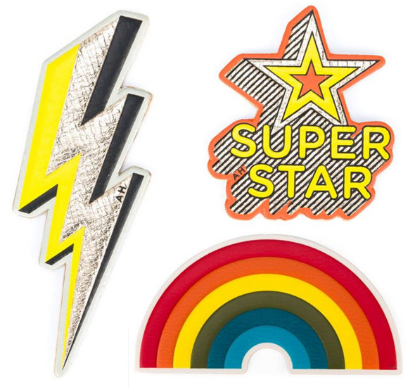 Наклейка в виде молнии, ок. 3 680 руб., наклейка в виде надписи, ок. 3 680 руб., наклейка в виде радуги, 10 350 руб. — все Anya Hindmarch
