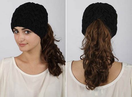 Эта шапка выполняет сразу две декоративных функции: демонстрирует саму модель и пышную прическу-хвост, выпущенный в отверстие. Данная модель появилась вследствие эволюции широкой вязаной повязки, популярной в 80-х годах: вязаная, трикотажная, повязка-обруч.