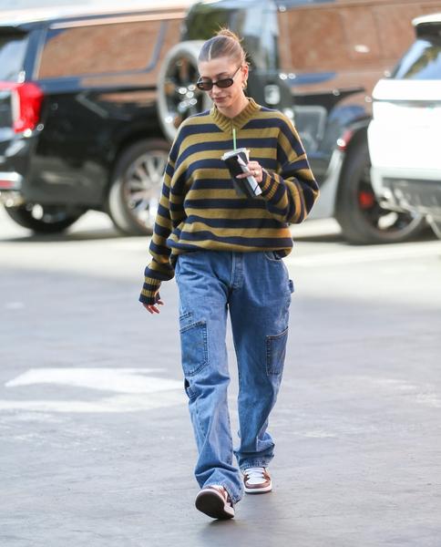 Для стильных повседневных вариантов стилизуйте бойфренды с яркими свитерами или свитшотами и удобными кроссовками, как это делает Хейли Бибер. Модель дополнила свой аутфит свободным свитером в полоску и массивными кедами Nike.
