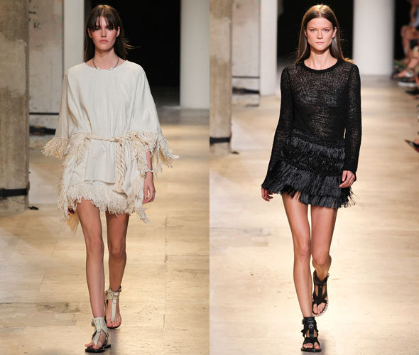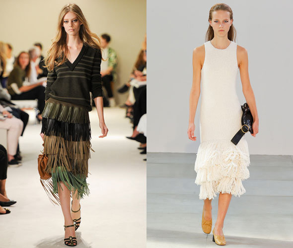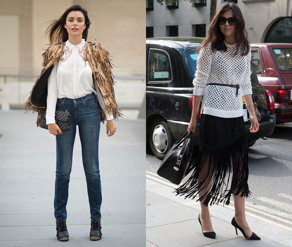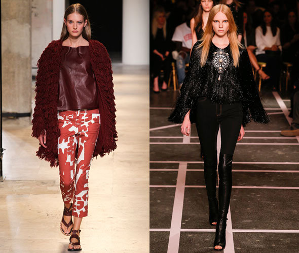 В этом сезоне дизайнеры обращаются к бахроме как к ключевому элементу декора. Замшевые юбки и куртки, кимоно и шали, декорированные бахромой, можно увидеть в коллекциях Saint Laurent, Isabel Marant, Chloe, Valentino, Givenchy, Sonia Rykiel, Louis Vuitton.